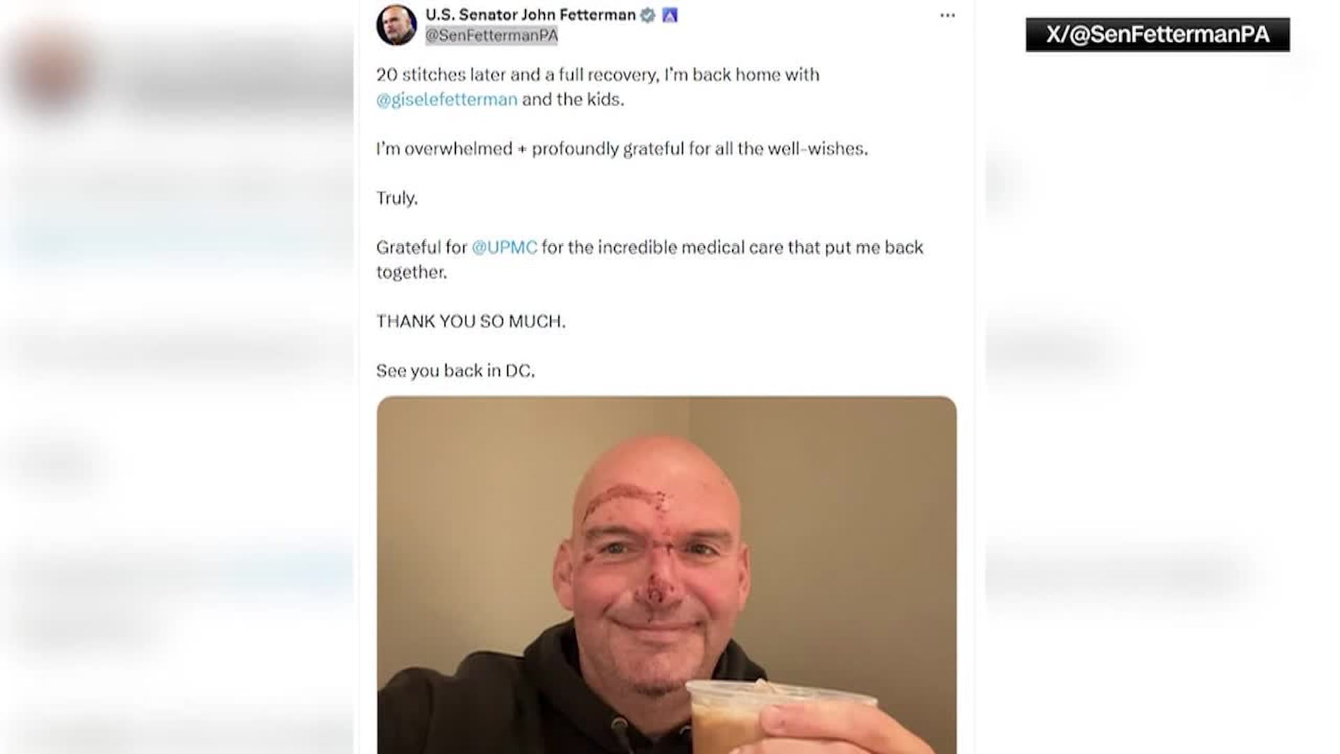 Despite the severity of the incident, Fetterman expressed deep gratitude for the medical professionals who cared for him. His message was both an update and a thank-you note to the team that “put me back together,” highlighting his appreciation for their skill and dedication during a challenging time.